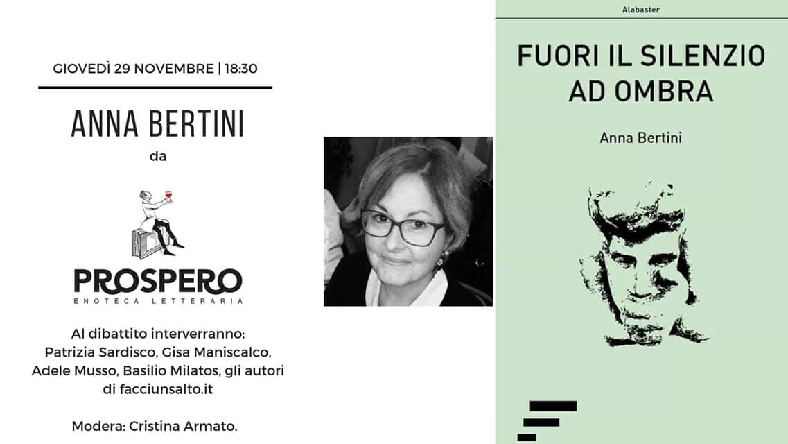 Giovedì 29 novembre alle ore 18:30 a Palermo presso l’appena inaugurata enoteca letteraria Prospero, l’autrice toscana Anna Bertini incontra lettori e amici siciliani per un dialogo intorno alla sua silloge ‘Fuori il silenzio ad ombra’ edito da Caosfera Edizioni.