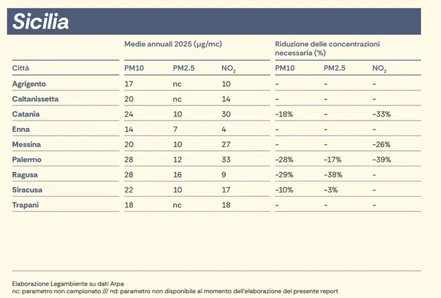 Le tre città metropolitane siciliane – Palermo, Catania e Messina – dovranno ridurre le concentrazioni di NO₂ rispettivamente del 39%, 33% e 26% per rispettare i nuovi limiti europei. Le principali fonti di NO₂ sono i processi di combustione, in particolare il traffico veicolare, soprattutto diesel, seguito da impianti di riscaldamento civili, industriali e attività portuali.