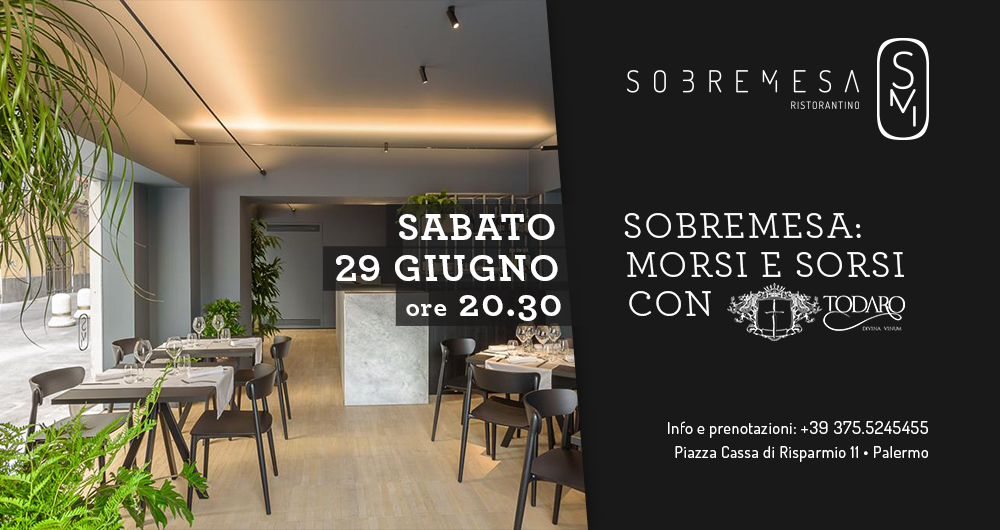 Il 29 giugno alle 20.30 andrà in scena l’arte per una serata sui generis dal nome “Sobremesa, morsi e sorsi con Todaro”. Il nuovo menù estivo sarà accompagnato dai vini dell’azienda Todaro, azienda di San Giuseppe Jato (Pa) che da pochissimo ha rinnovato la sua cantina, in un percorso multisensoriale. Ospite in sala sarà proprio il produttore Giuseppe Todaro che, insieme al giornalista palermitano e sommelier Ais Italia Marcello Malta, descriverà i vini da vitigni autoctoni dell’azienda.