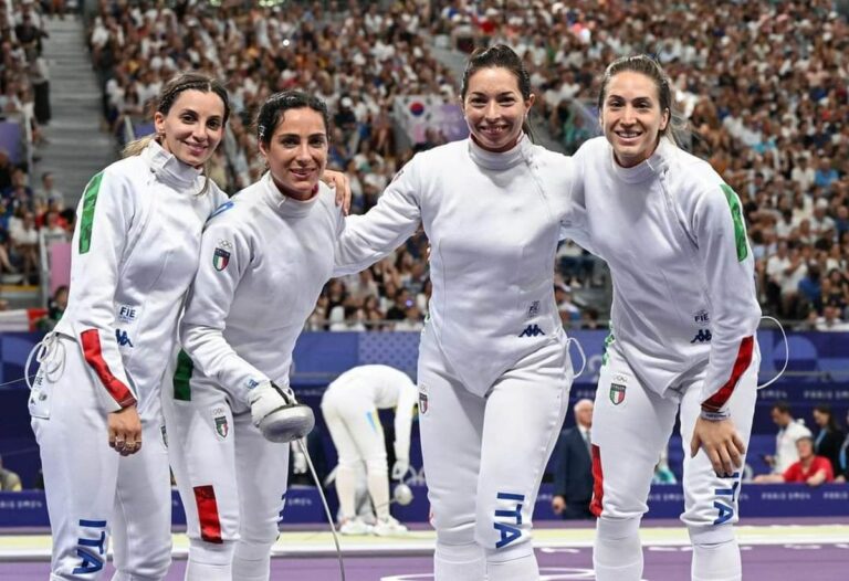 L’Italia della spada femminile ha vinto la medaglia d’oro nel torneo a squadre nei Giochi Olimpici di Parigi 2024. Le azzurre Alberta Santuccio, Giulia Rizzi, Rossella Fiamingo, Mara Navarria hanno battuto la Francia 30-29 grazie all’ultima stoccata della stessa Santuccio. Giornata trionfale per le ragazze del ct Dario Chiadò: ai quarti battute le egiziane (39-26), in semifinale è arrivata la larga vittoria contro la Cina (45-24). La medaglia di bronzo è stata vinta invece dalla Polonia che ha battuto la Cina 32-31. Seconda medaglia consecutiva per la spada femminile a squadre, bissato il bronzo ottenuto alle Olimpiadi di Tokyo mentre per la scherma è la terza medaglia dopo l’argento di Filippo Macchi nel fioretto e il bronzo di Luigi Samele nella sciabola.