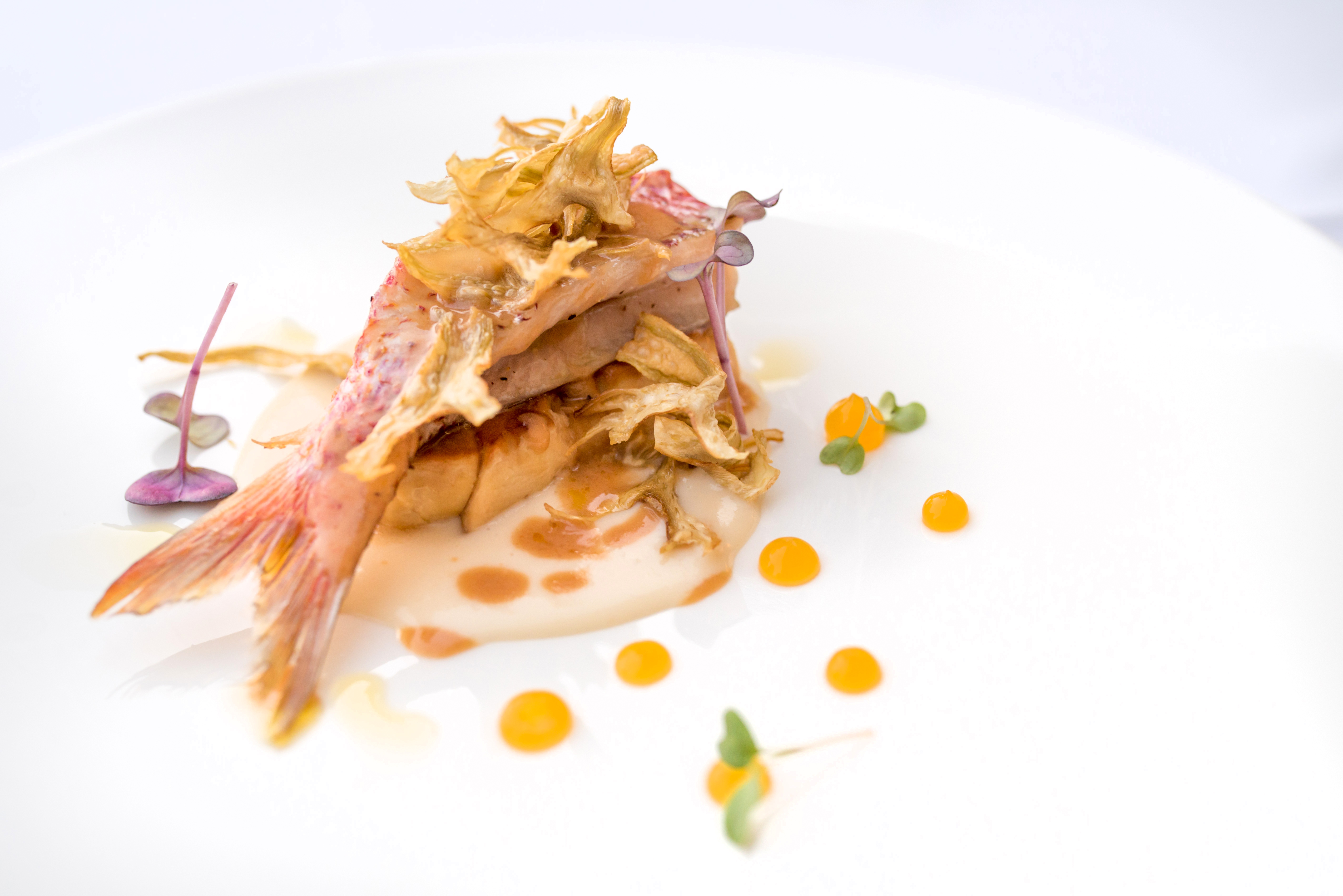 Disporre la crema di topinambur a specchio sul piatto e adagiare sopra la scaloppa di foie gras insieme con la triglia precedentemente cotta a 170 °C in forno per 7 min. Completare il piatto adagiando le chips di carciofi croccanti sulla triglia e disporre intorno la gelatina di passion fruit.