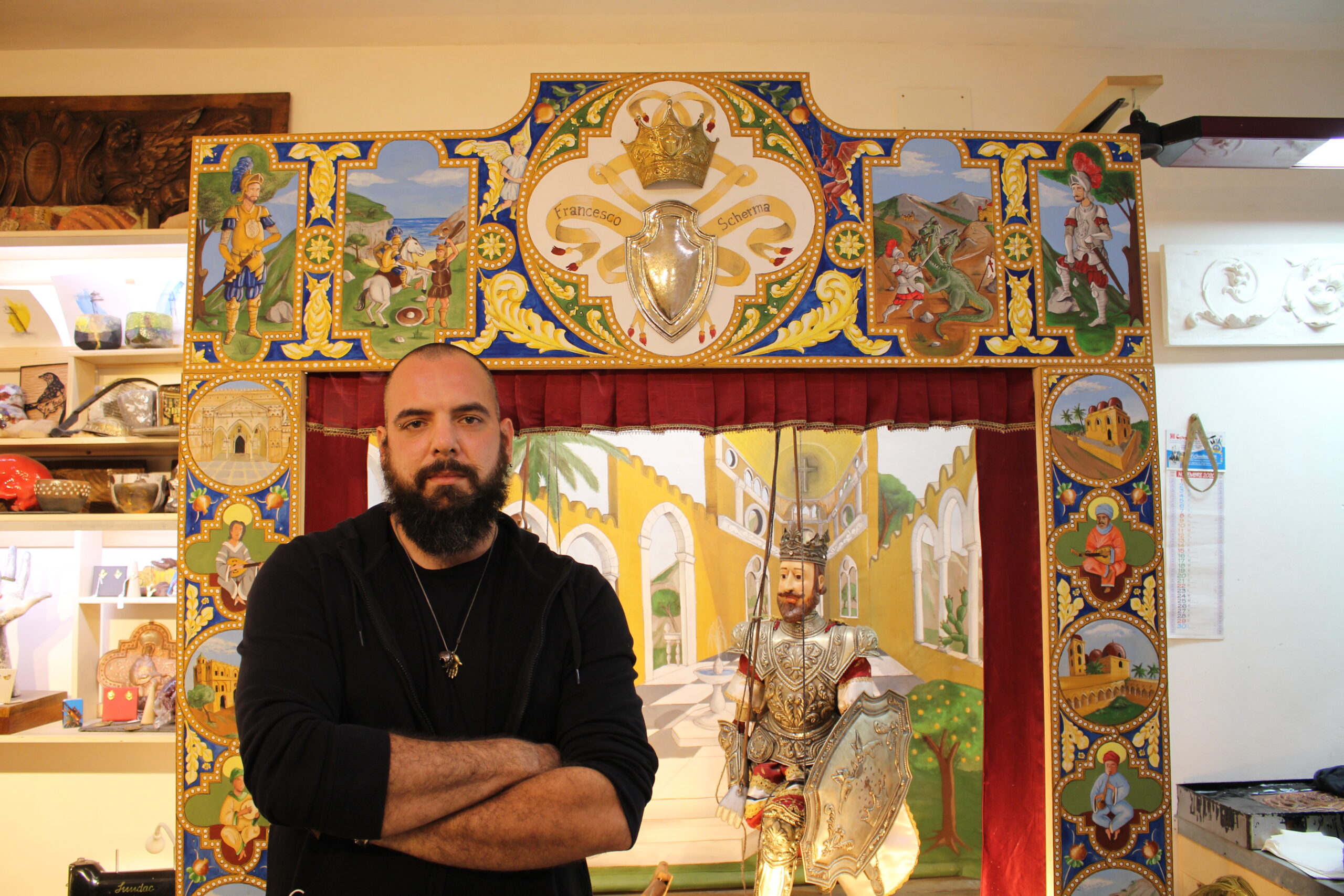 Il laboratorio di Francesco nasce accanto a Ferramenta, locale che costituisce l’unico barlume di modernità a piazza Giovanni Meli, uno di quei cortili a Palermo in cui sembra che il tempo non voglia passare. Protagonisti di tutto sono i pupi: al centro del laboratorio un teatrino illuminato domina la scena con Carlo Magno impettito fissato dagli occhi vispi dell’angelo che gli plana accanto con un’armatura argento vivo e drappeggi azzurri. In alto, al centro di uno stemma araldico campeggia il nome “Francesco Scherma” di cui lo stesso Francesco sorride imbarazzato, temendo di avere esagerato.