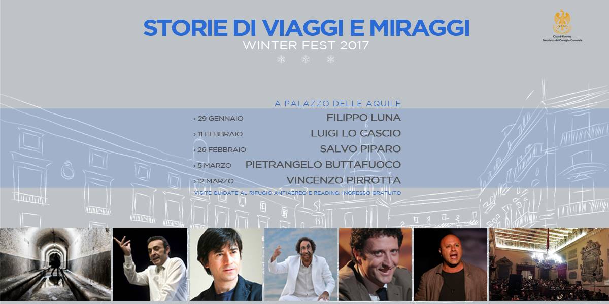 PALERMO – La Presidenza del Consiglio comunale di Palermo, in collaborazione con l’associazione culturale Kleis, la cooperativa Terradamare e l’associazione Ro’n Ro Cult, organizza presso le sede di Palazzo delle Aquile “Winter Fest 2017 – Storie di viaggi e miraggi“.