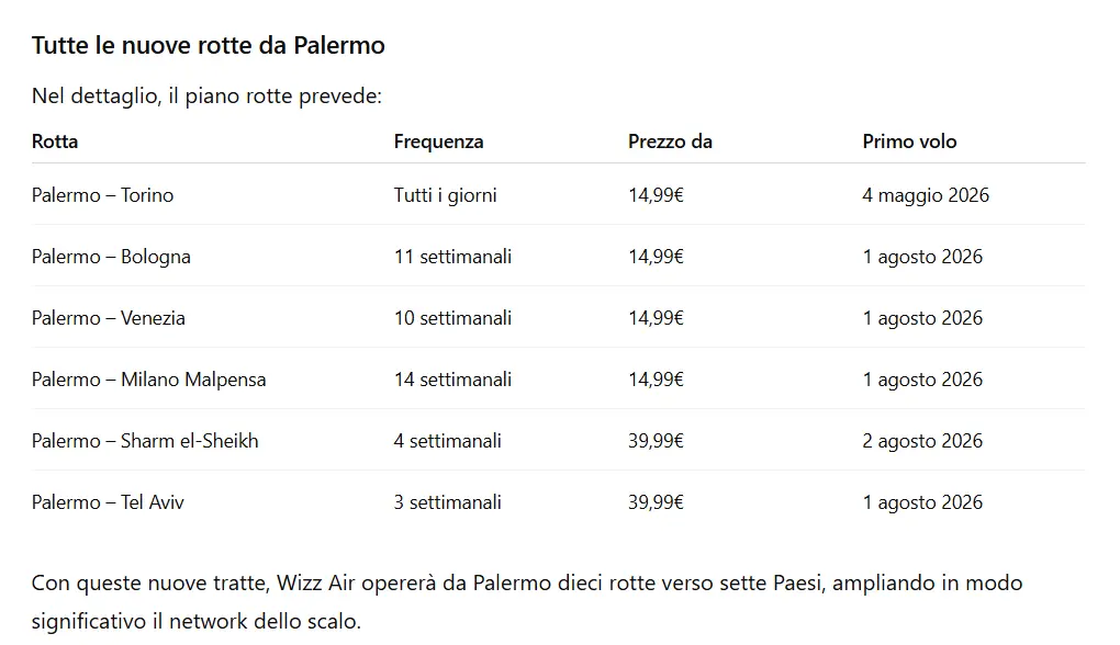 Si tratta di collegamenti particolarmente strategici, in grado di attrarre sia il turismo outgoing dei siciliani verso mete internazionali molto richieste, sia flussi turistici in ingresso verso Palermo e la Sicilia.